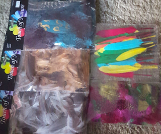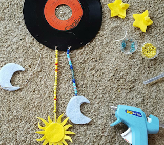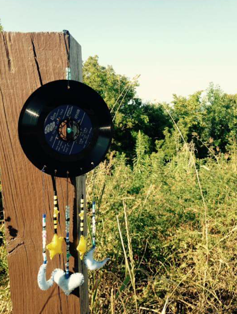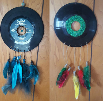 I hot glue string or hemp cord to the feathers or shapes. I add beads and tie the ends into the holes I made at the bottom of the vinyl.