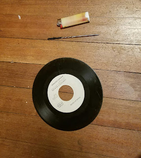 To make the dream catchers, I start by making holes in the vinyl. I do this by heating up a drill bit with a lighter until it’s hot enough to push through the record. It’s important to do this part in a well ventilated area because it smells awful and the fumes should not be inhaled.